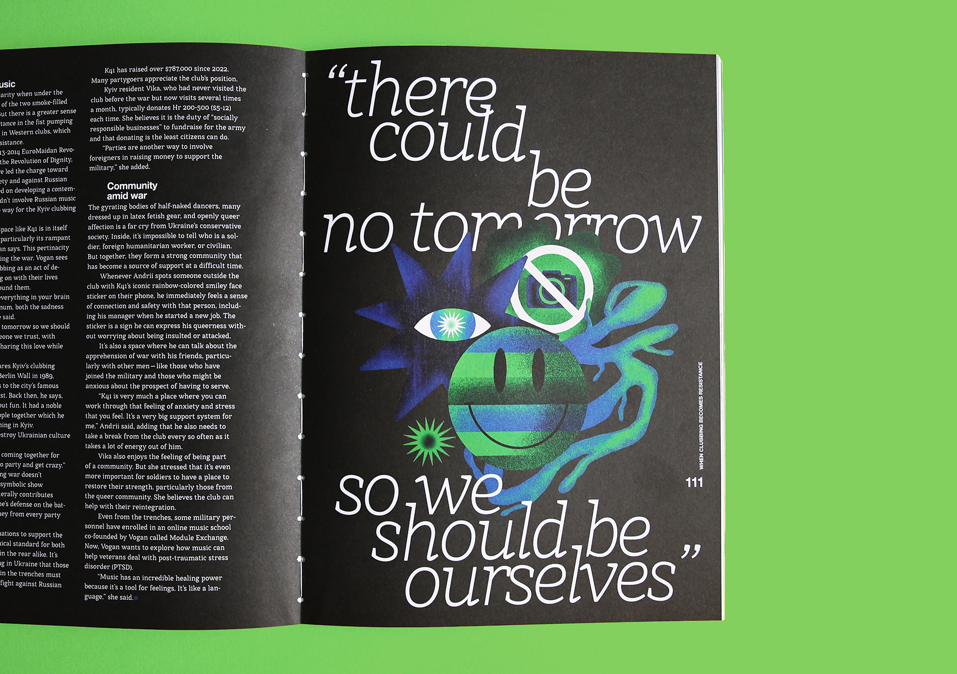 Illustrations for the print edition of the online magazine The Kyiv Independent for an article about how Kyiv rave community is accumulating its events to help the army and civilians during the Russian invasion of Ukraine.